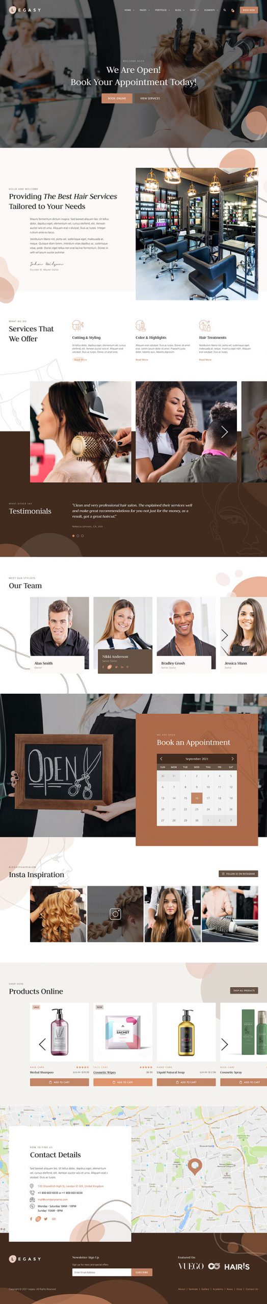 We prepared 4 Home Pages: Hair Salon, Nail Salon, SPA Salon & Aesthetics Clinic. Unlimited color skins and numerous inner pages such as 8 Portfolios and 7 Single Portfolio pages, 4 Galleries, Shop pages, 2 Contact pages, About Us and Special Offers, Academy, Team, 7 Blog Pages, 404 and Coming Soon pages and many Elements.